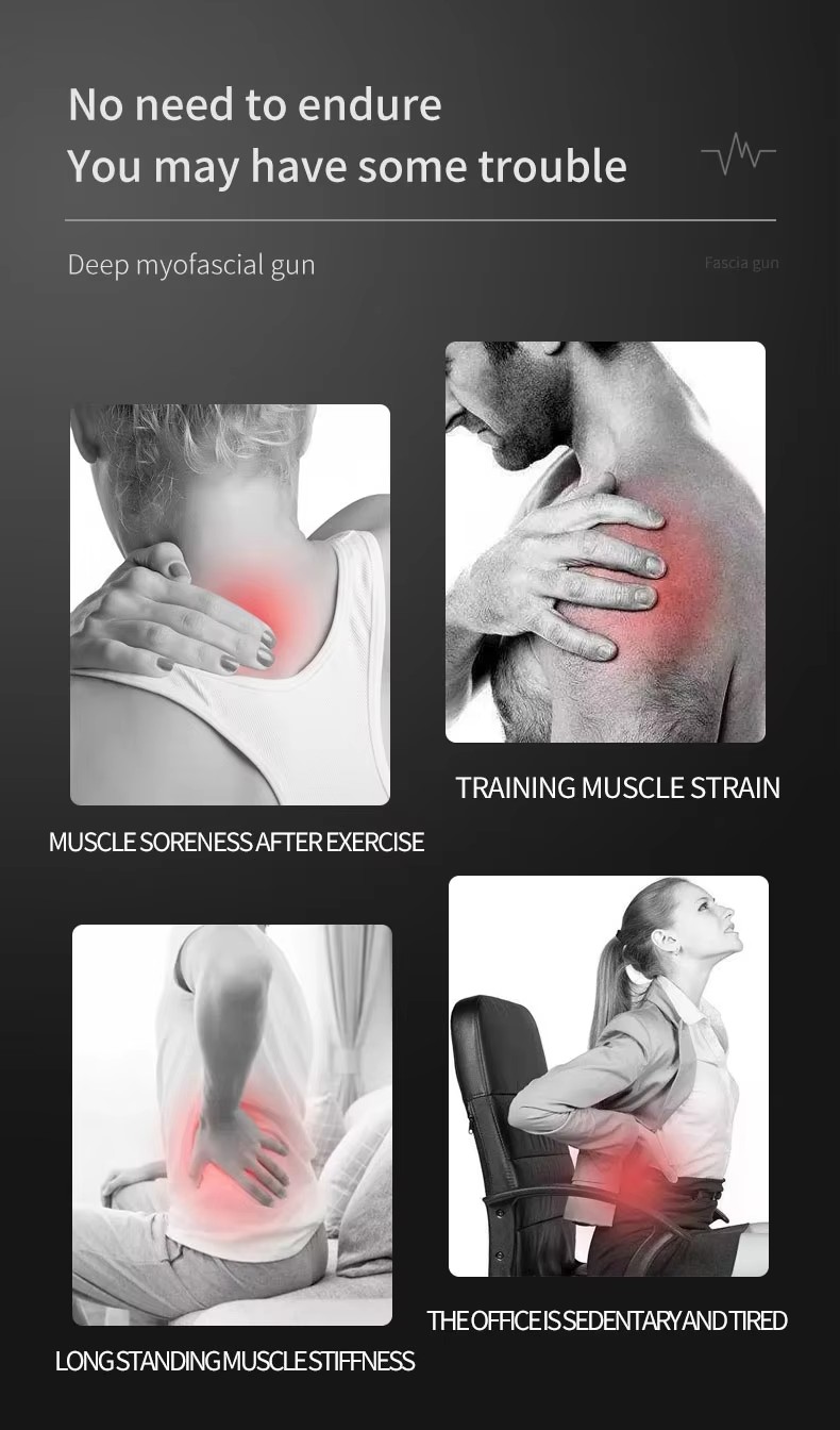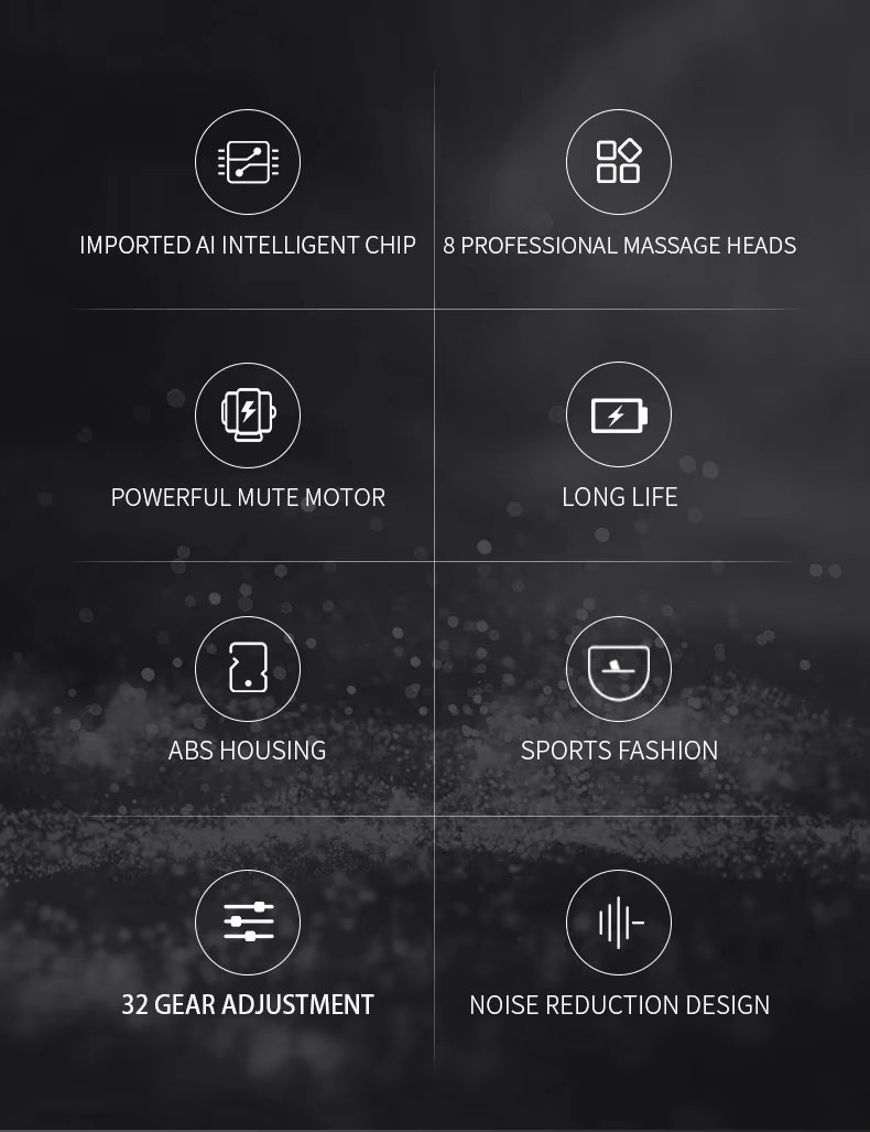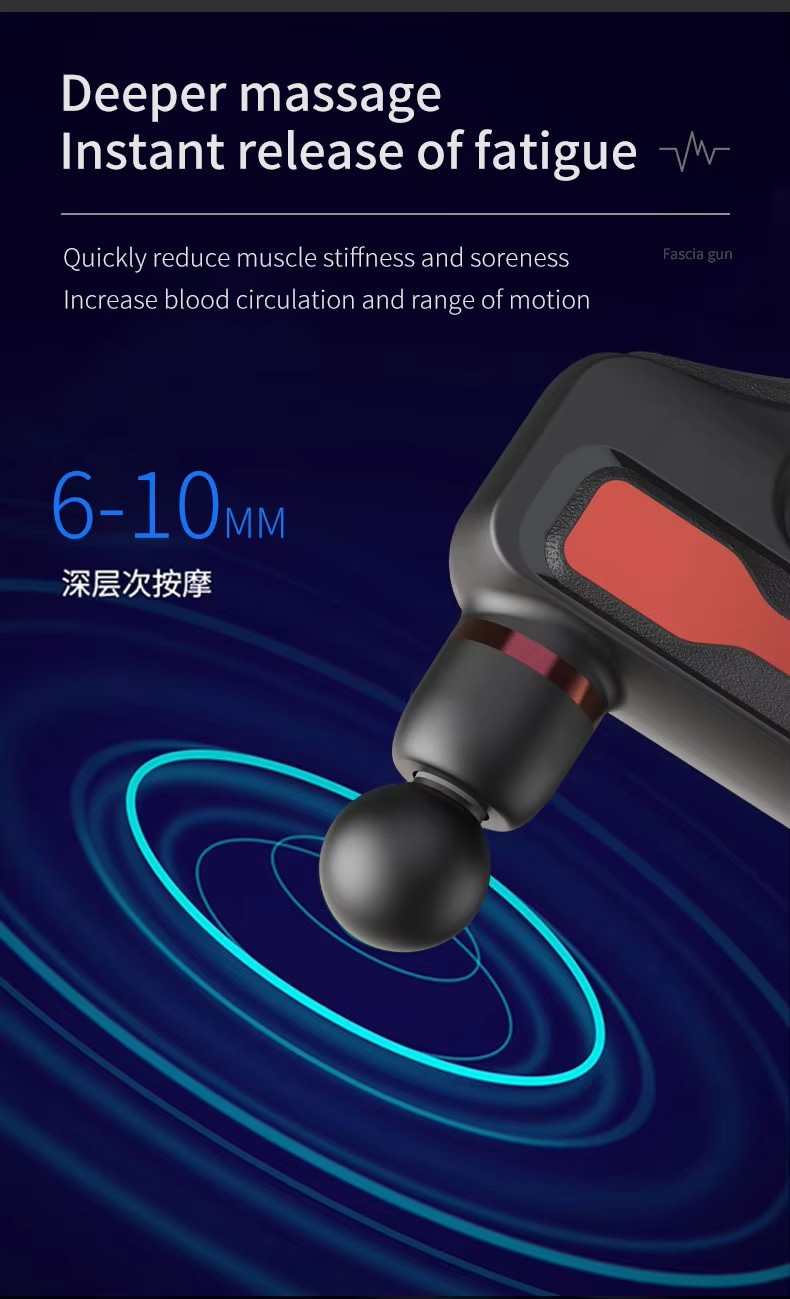 Functions | 1.This multi-features muscle massage gun could relieve muscle soreness after exercise,reduce muscle stiffness and soreness,health massage relieve fatigue. 2.32 speeds and 8 different heads to fit different massage requirements. 3.High frequency and 6~10mm deep stimulating massage to relax and crush lactic acid. 4.Powerful and silent motor which is around 45dB noise. 5.Around 1.5 hours power lasting after a full charging. 6.Mini portable and fashion design. 7 .Packed with gift box. |